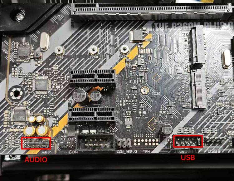 根据线材英文标识接主板USB插孔和音频插口